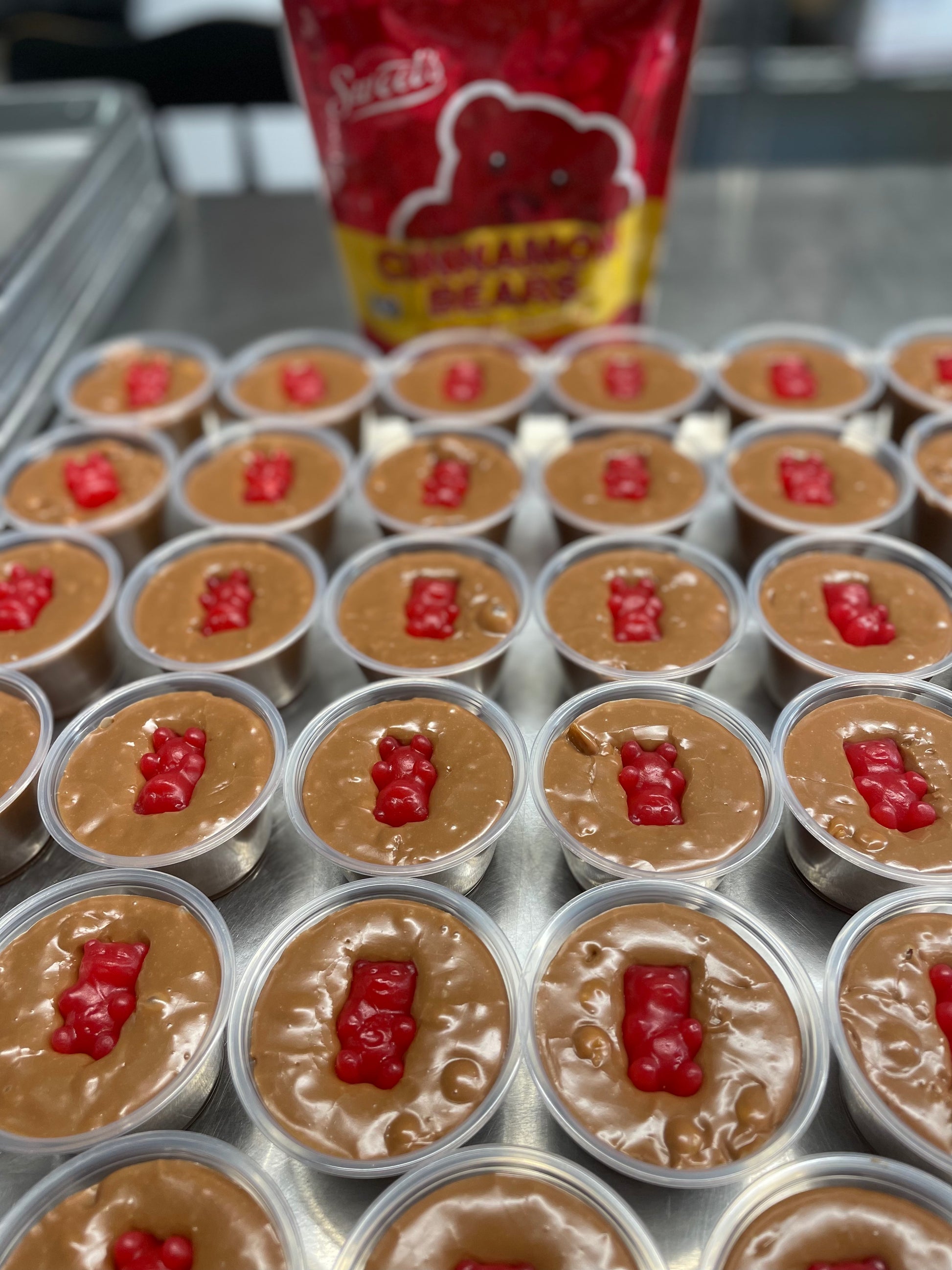 Creamy Milk Chocolate Cinnamon fudge with chewy Caramel in every bite and a Cinnamon Bear on top.